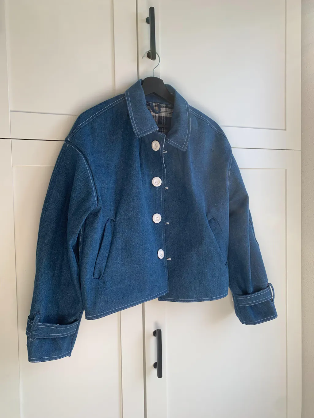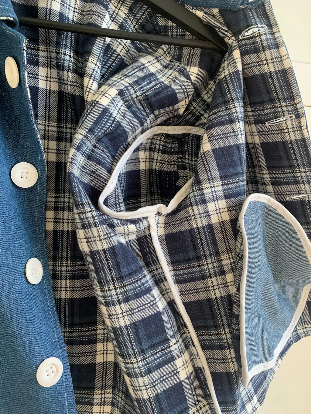 The coat has welt pockets on the front. The pocket bags are visible on the inside of the coat, seams are fully hidden and the edge is bound with bias binding.
